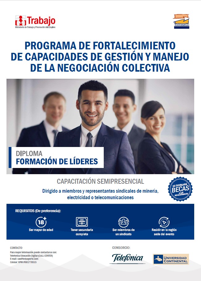 "Programa de Fortalecimiento de Capacidades de Gestión y Manejo de la Negociación colectiva", promovido por el Ministerio de Trabajo y Promoción del Empleo, teniendo como instituciones responsables en su desarrollo a la Universidad Continental y Telefónica Educación Digital, ambas con amplia experiencia en los espacios de la educación y aprendizaje interactivo.Se dará incio al Diplomado Gratuito de "FORMACIÓN DE LÍDERES", con modalidad es semi- presencial, y cuyos módulos son:
